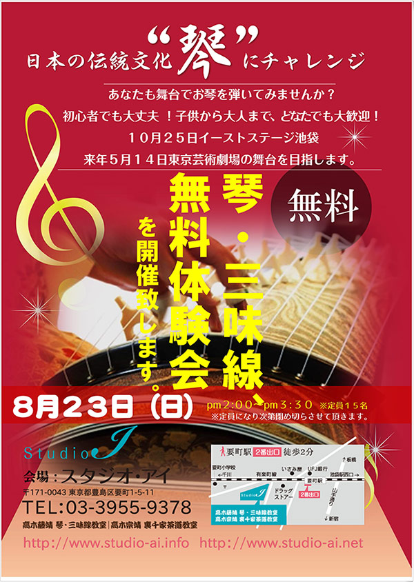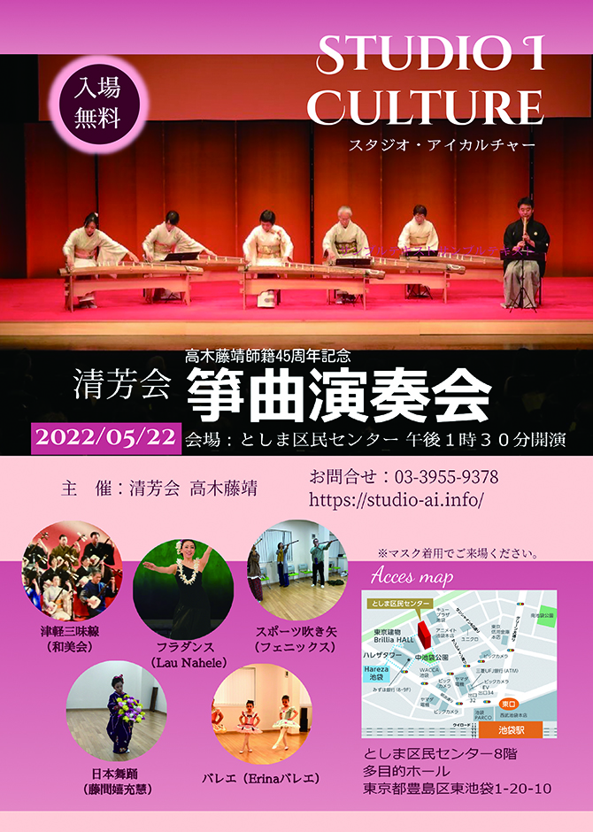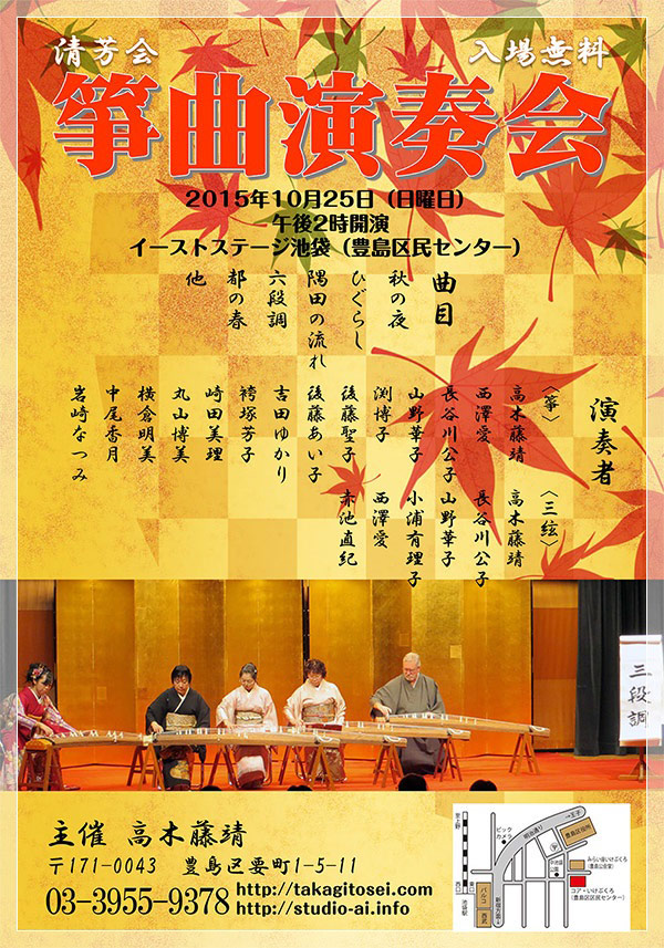 2015年10月25日(日曜日)、清芳会 筝曲演奏会を開催致します。 会場:イーストステージ池袋(豊島区民文化ホール) |