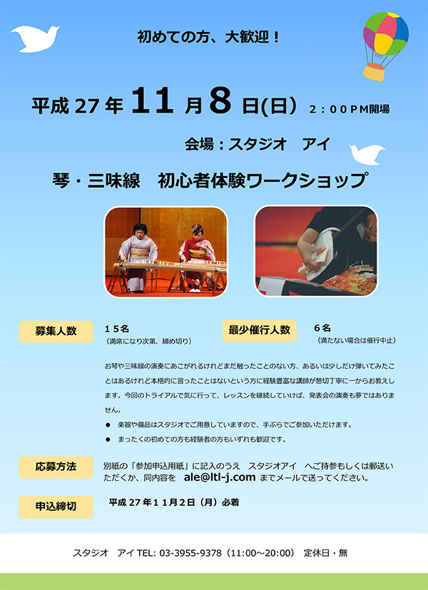 | 11月8日「初心者体験ワークショップ」は無事終了いたしました。 ご来場の皆様、誠にありがとうございました。 |