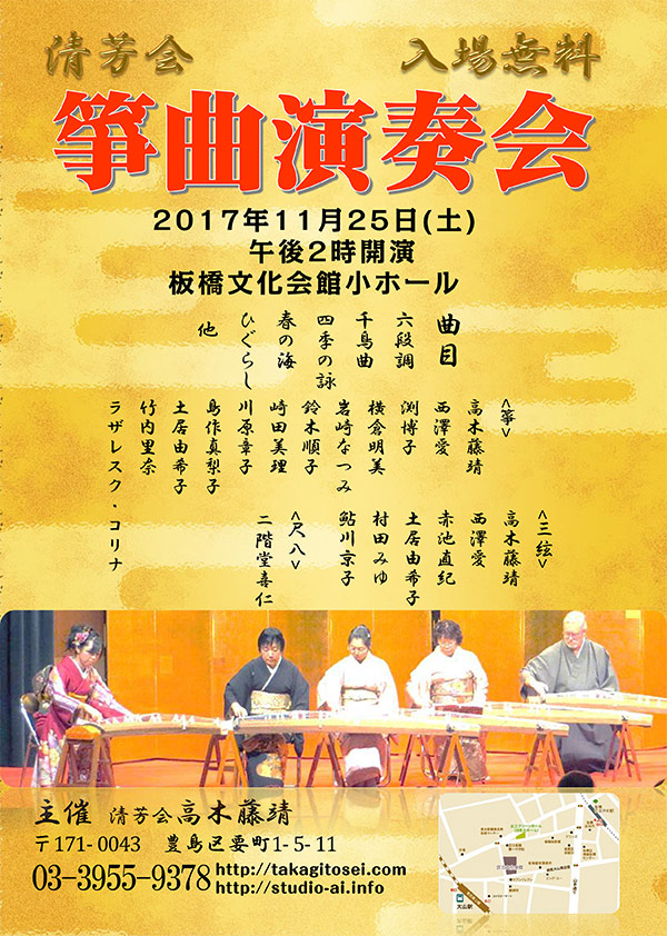 | 2017年11月25日(土曜日) 板橋文化会館小ホールで筝曲演奏会を開催致します。 |
