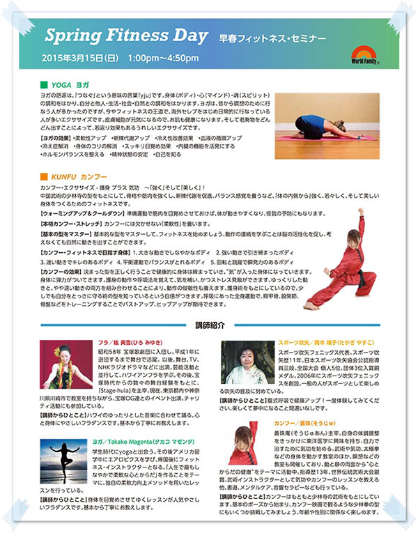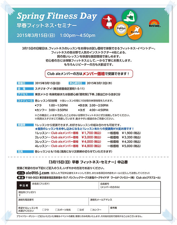 | ※フィットネスセミナーは終了いたしました。 3月15目の日曜日は、フィットネスのレッスンをお得なお試し価格で体験できるフィットネス・イベントデー。 フィットネスの各分野で人気のインストラクター4名による、 質の商いレッスンを快適な環境で楽しめます。 初心者の方には体験フィットネスとして、一から丁寧にお教えします。 もちろんリピーターの方も大歓迎です。 club-ale: http://club-ale.com/ |