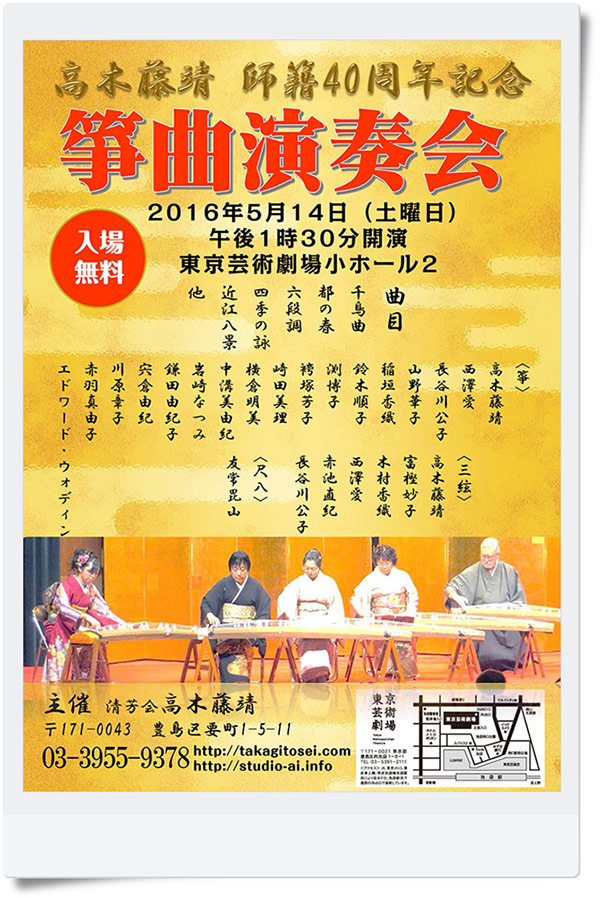 | 2016年5月14日(土曜日) 高木藤靖 師籍40周年記念 箏曲演奏会 |